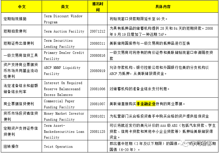 美联储在2007-2008年金融危机期间可能是最具创新性的,推出了近10种创新货币政策工具,按时间先后顺序具体如定期贴现措施、短期拍卖便利、定期证券出借便利、一级交易商信贷工具、资产支持商业银行票据货币市场共同基金流动性便利、法定准备结余和超额储备结余利率、商业票据融资便利、货币市场投资者融资便利、定期资产支持证券贷款便利、扭转操作等等。
