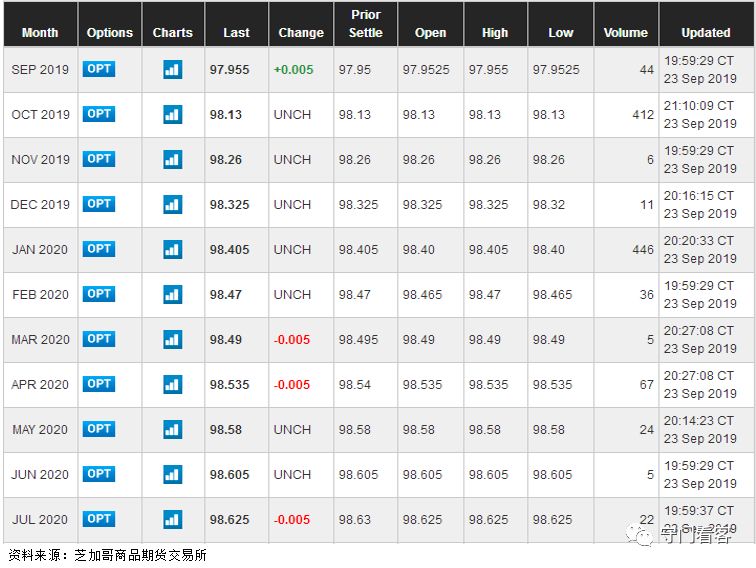 下图是笔者截取CME关于美国30天的联邦基金利率期货最新市场信息(2019年9月24日),由于30天的预测通常较为准确,超过1个月以上的预测受到的市场干扰较多,因此在该例子中我们选择对10月份的利率变动进行预测(美联储今年还有2次议息,分别10月29日-10月30日和12月10日-12月11日)。