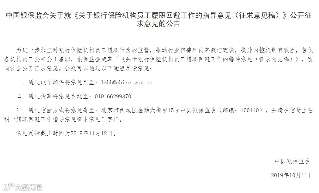 为进一步加强对银行保险机构员工履职行为的监管,推动行业自律和内部廉洁建设,提升内控机制有效性,督促各机构员工公平公正履职,银保监会起草了《关于银行保险机构员工履职回避工作的指导意见(征求意见稿)》(以下简称《指导意见》),现向社会公开征求意见。银保监会将根据各界反馈意见,进一步修改完善并适时发布实施。