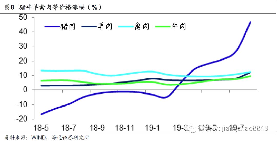 今年推动物价上涨的主要是猪价,8月份CPI猪价环比上涨23.1%,同比上涨46.7%,直接拉动CPI上涨约1.3%。而且由于猪价的大涨,带动了牛羊肉和禽蛋价格的普涨,8月的牛肉、羊肉、禽肉价格涨幅分别升至12.3%、12.5%和9.6%。此外,今年8月份的水果价格也大涨了24%。