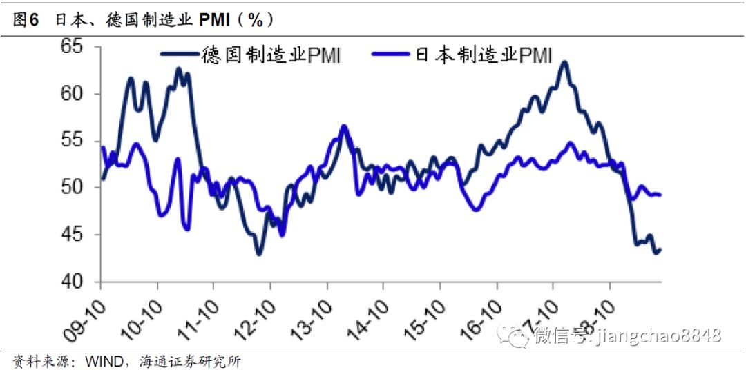在8月份,德日两国的制造业PMI指标均处于收缩区间。其中德国制造业PMI仅为43.5%,处于过去10年的最低点附近;而日本制造业PMI为49.3%,也处于3年低点,制造业的收缩使得其物价产生了通缩的压力。
