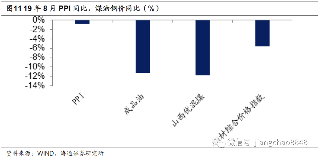 根据我们的估算,油价、钢价和煤价是影响中国PPI的三大核心商品价格,而截止今年8月份,国内成品油价格同比下跌11.2%,山西优混煤价同比下跌11.8%,国内钢材综合价格指数同比下跌5.6%,商品价格的普跌使得PPI步入通缩区间。