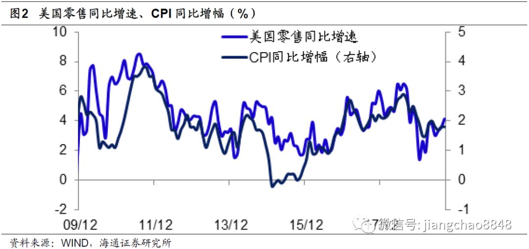 历史数据显示,美国商品零售增速与通胀走势高度相关,近10年美国零售增速大约是同期物价涨幅的2倍左右。而8月美国零售增速回升至4%,与之对应的CPI涨幅就在2%左右。