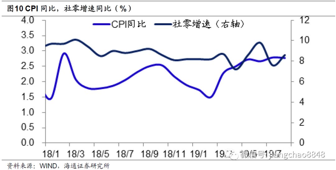 另一方面也有经济基本面的支撑。今年虽然经济增速稳中有降,但是经济中占比最大的消费增速保持稳中有升。今年年初时,社会消费品零售总额增速仅为8.2%,而在最近的2个月,社零增速平均为8.7%。
