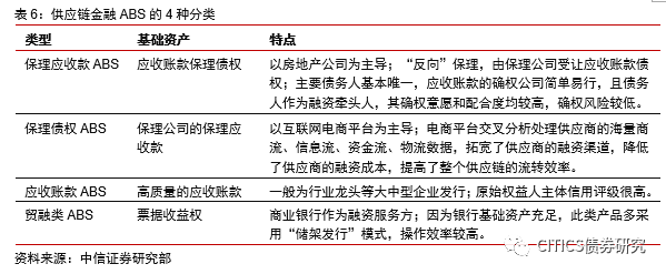 供应链金融ABS的主要类型。目前根据供应链金融ABS的业务类型、融资人的信用水平,可以将供应链金融ABS产品分为4类:以房地产公司为主导的保理应收款ABS、以互联网电商平台为主导的保理债权ABS、大中型企业等高信用评级主体发行的应收账款ABS和贸融类应收账款ABS。