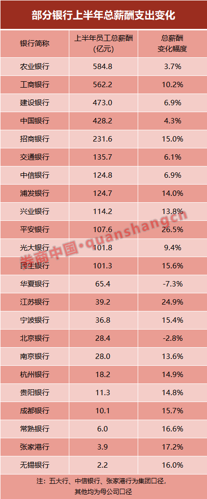 其中,平安银行、江苏银行总薪酬支出增长较快,增幅分别达26.5%、24.9%。张家港、常熟、无锡3家上市农商行上半年总薪酬支出也实现16%以上的同比增长。