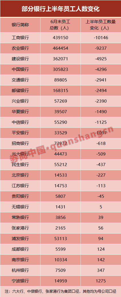 如果把港股上市的邮储银行计入在内,六家国有大行上半年合计减员3.4万人,超过去年全年,这还不包括同期减少的740名劳务派遣员工。
