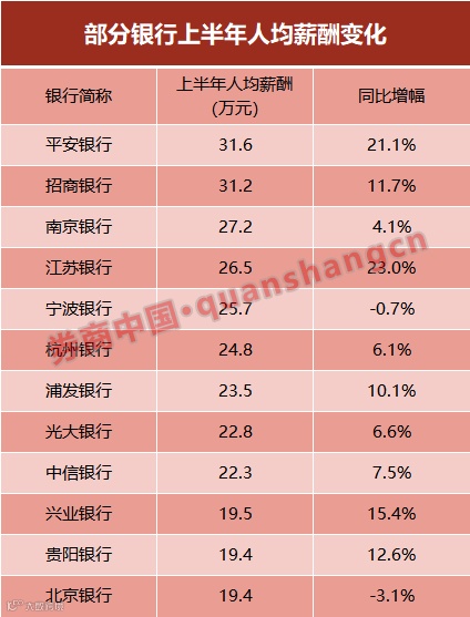 具体来看,23家银行里,上半年人均薪酬同比增幅在10%以上的就有12家,其中更有5家增幅超过15%,分别是江苏银行、平安银行、兴业银行、成都银行和无锡银行,前两家增幅分别是23%、21%,后三家的也在15%~16%之间。