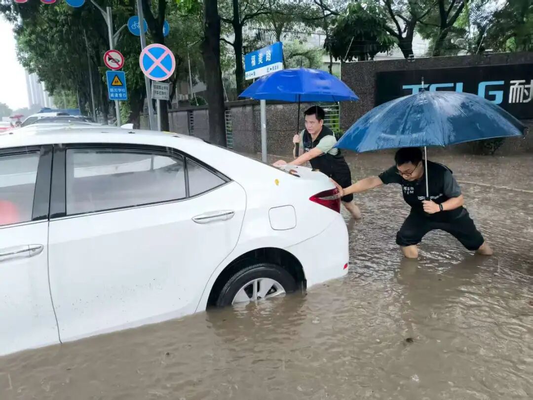 应急人员在积水严重的路段设置警示标志,引导车辆和行人绕行。对于被困在积水中的车辆和群众,他们第一时间展开救援,用最快的速度将受困人员转移到安全地带。