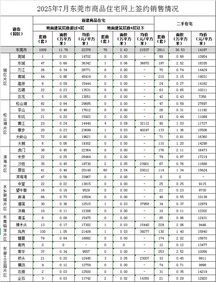 数据显示,2025年7月,东莞一手洋房(地面建筑层数超过4层的新建商品住宅)网签均价为22378元/平方米,环比基本持平;二手住宅网签均价为14187元/平方米,环比下降2%。