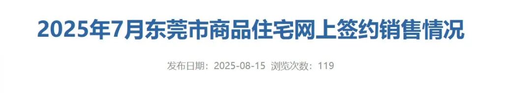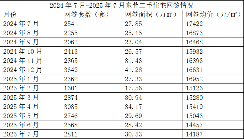 市住建局数据显示,2025年7月,东莞二手住宅网签2811套,环比增加9%,同比增加11%;网签面积为30.53万平方米,环比增加7%,同比增加10%;网签均价为14187元/平方米,环比下降2%,同比下降19%。
