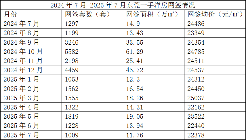 市住建局数据显示,2025年7月,东莞一手洋房网签均价为22378元/平方米,环比基本持平,同比下降9%。