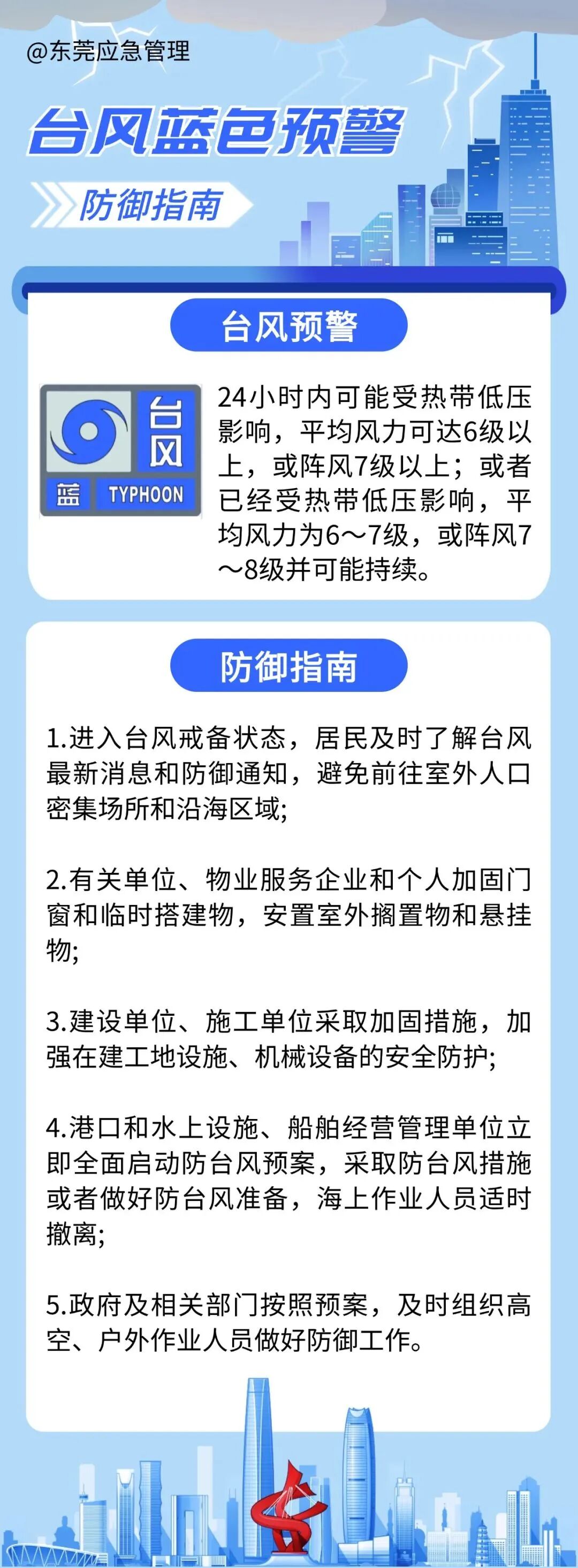 受台风“塔巴”影响,预计东莞7日—9日将有暴雨、局部大暴雨,伴有7到8级、沿海和高地9到10级阵风,东莞市气象台9月7日11时00分将台风白色预警信号升级为蓝色,请注意做好防御。