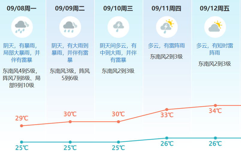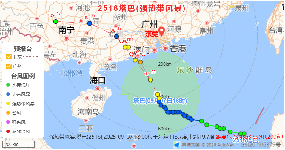 东莞市气象台预测,受“塔巴”影响,东莞7日夜间—8日风雨将加大,有暴雨、局部大暴雨,并伴有7到8级、沿海及高地9到10级阵风;9日有大雨到暴雨;展望10日仍有中到大雨。