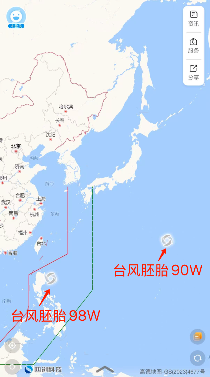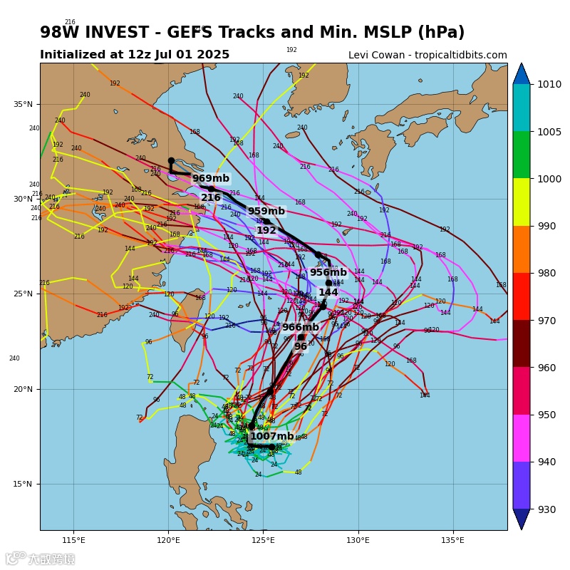 另外一边,台风胚胎98W已经来到菲律宾吕宋岛东岸附近。台风胚胎98W目前位于北纬16.9度、东经124度,最大风力20KT(10.3米/秒),中心最低气压1005百帕。