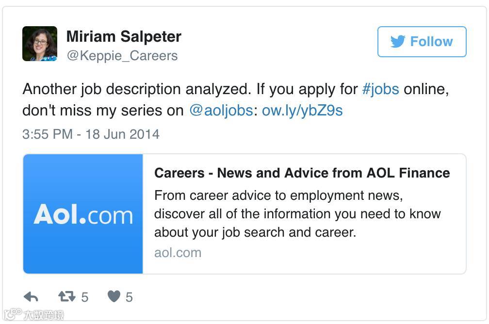 在Twitter上关注一些job search experts,让自己轻松获得即时更新的信息。在这里小编给大家列出10个值得follow的job search experts @jobjenny,@EntryLevelRebel @careersherpa @MRGottschalk @Keppie_Careers @acpeters@AlisonDoyle @kevincgrubb @Adrienne_Tom @LeaMcLeod