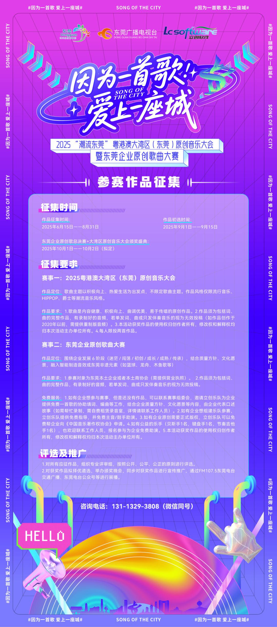 双重赛道:2025“潮流东莞” 粤港澳大湾区(东莞)原创音乐大会面向个人/组合/乐队,东莞企业原创歌曲大赛面向本土企业/商协会,找准赛道更出彩!🎤