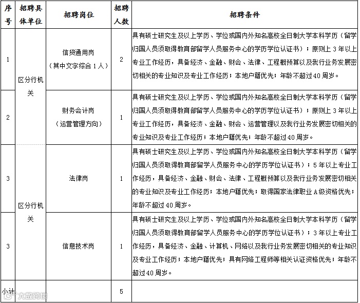 招聘单位区分行机关,招聘岗位共5个,具体要求如下。