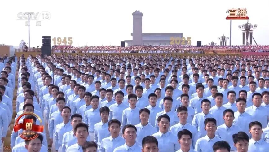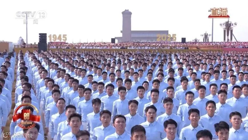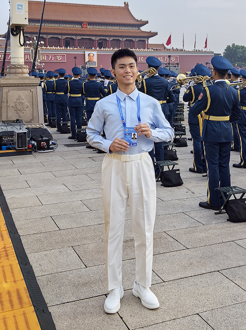 郭铭江说:“从来没有想过有一天我能站在天安门前参加阅兵仪式,我在广场上和三千名北京高校学生一同唱响抗战歌曲。初秋仍然炎热,太阳晒得几乎睁不开眼,军乐团前奏响起,我们高声唱着,艰苦的抗战史在我们眼前展开。国歌响起,我从未如此深刻地体会到‘用血肉筑成我们新的长城’这句话的重量。”