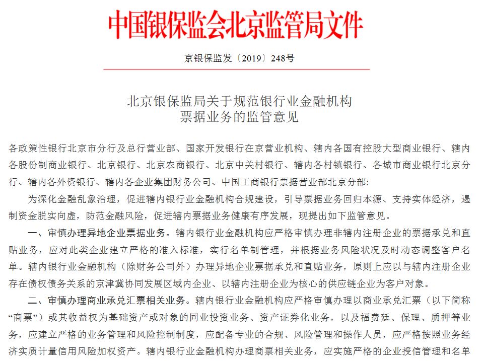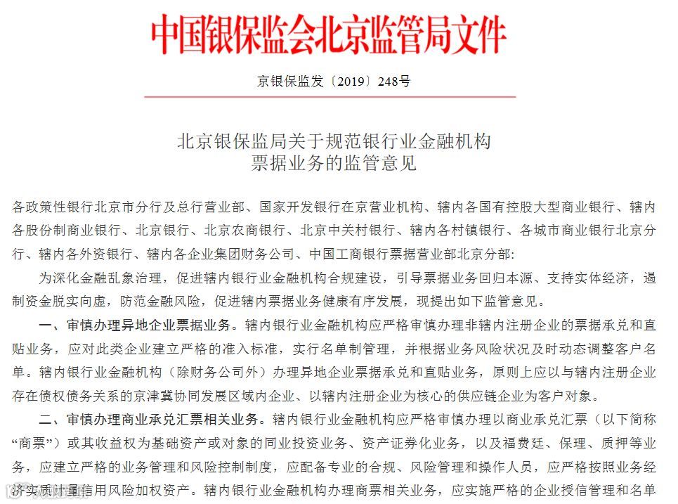 北京银保监局7月25日正式对外发布《关于规范银行业金融机构票据业务的监管意见》(以下简称:《意见》)。