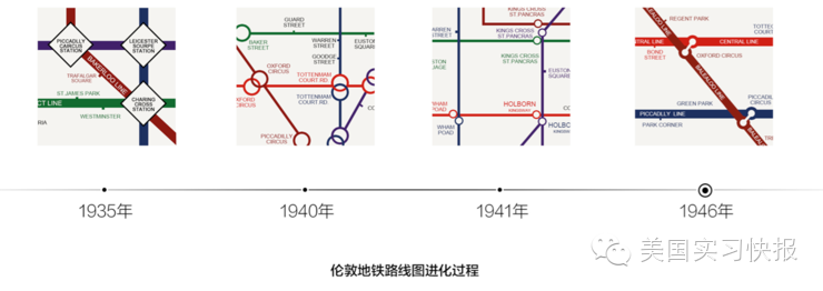 伦敦地铁路线图进化过程:查看1935年至1946年间贝克的路线图设计,可以发现其换乘的表现手法有变化。1935年的换乘站点以方块表示,车站的名称要容纳在其中,对字体的大小长度都有了限制,让人难以阅读;1940年和1941年的线路图,换乘站名称写在圆圈旁边,但每条线路都会标注同样的名称,出现多余文字信息;1946年的路线图,相接的圆用白线连接,将换乘站用更容易识别的方式表现出来,之前重复的站名也改为只标记一次,更简单和容易阅读。