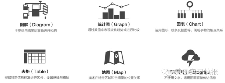 信息图的分类有很多种,各分类之间也并不是泾渭分明,所以大可不必纠结什么样的分法最正确,在木村博之所著的《图解力》一书中,他将信息图分为六大类:图解(Diagram)、图表(Chart)、表格(Table)、统计图(Graph)、地图(Map)、和图形符号(Pictogram)。