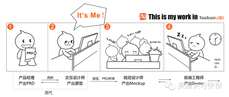 My Work In Taobao UED:这是我曾经为淘宝工作时的流程而配的插图;通过运用插图来表现每个职位人员的特征,让画面更生动有趣,但是应该加大各个角色之间的差异,有助于减少歧义,而且图形和文字关系疏离,并没有很好地结合。