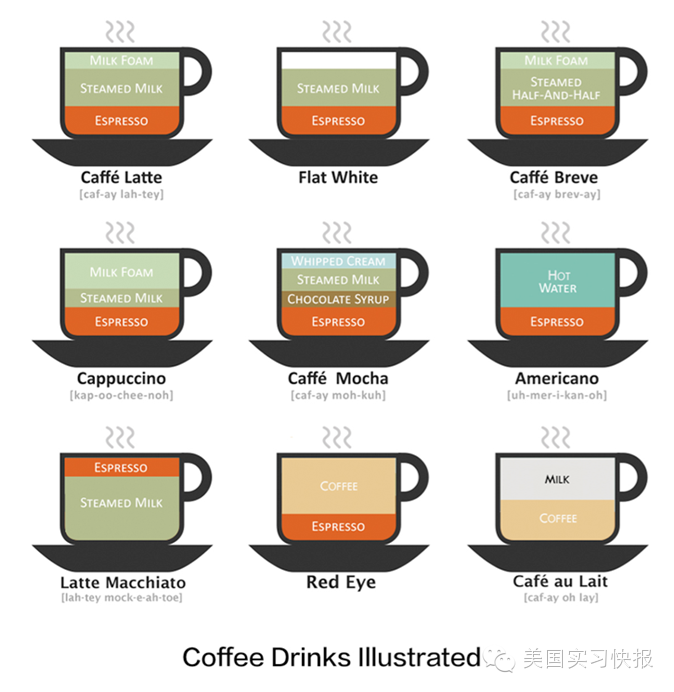 Coffee Drinks Illustrated:关于咖啡种类的说明,通过一杯咖啡的图形样式,不但直观的表现出不同种类咖啡的成分组成,而且各成分之间的比例关系也一眼就看出。