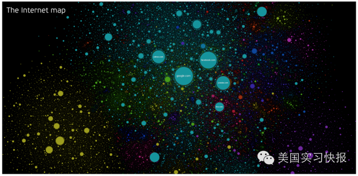 The Internet Map : 将全球网站以星系的形式表现,流量越大,表示圆点越大,颜色代表不同国家