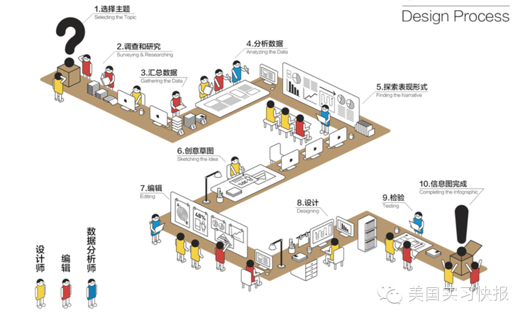 信息图的制作是一个团队合作的过程,在平时的设计中可能并没有严格按照下面的流程来做,但是可以从中理解到信息图的核心是传达主题!