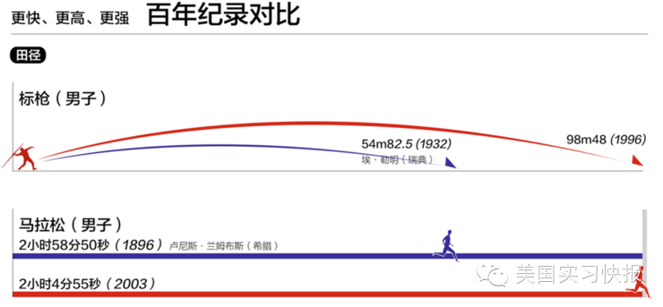 百年纪录对比:马拉松这类花时间越少,成绩越优秀的项目,如果用常规的柱状图绘制,那么明明最快的成绩却看上去感觉最慢。这张图中将最快的记录用100%表示,然后以此为基准,画出不同参赛者的相对位置,让人一目了然。