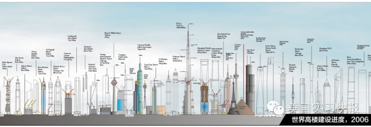 世界高楼建设进度(2006):图中将世界各个著名的高楼放在同一画面中来做比较,不仅能明显看出它们之间高度的差异,作者更要表达的是这些高楼目前的建设进度,通过将高楼建成的部分进行上色,而未建成的部分用线条勾勒,来进行自身差异化的表现。
