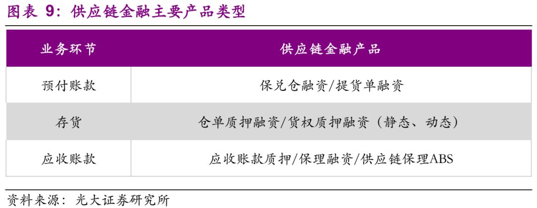 基于供应链金融服务衍生出来的金融产品是多样的,基本上可以总结为:预付款环节下主要是保兑仓融资/提货单融资;存货环节主要是仓单质押融资/货权质押融资;应收账款环节主要是应收账款保理融资、应收账款质押融资、应收账款证券化等。