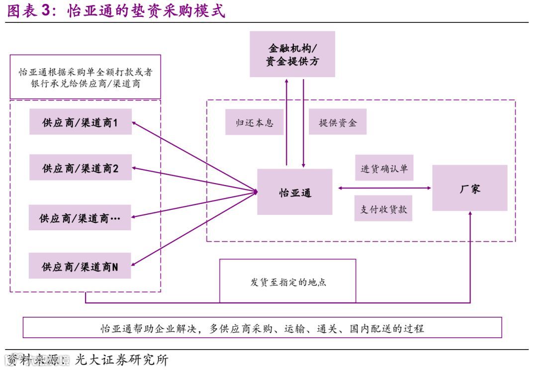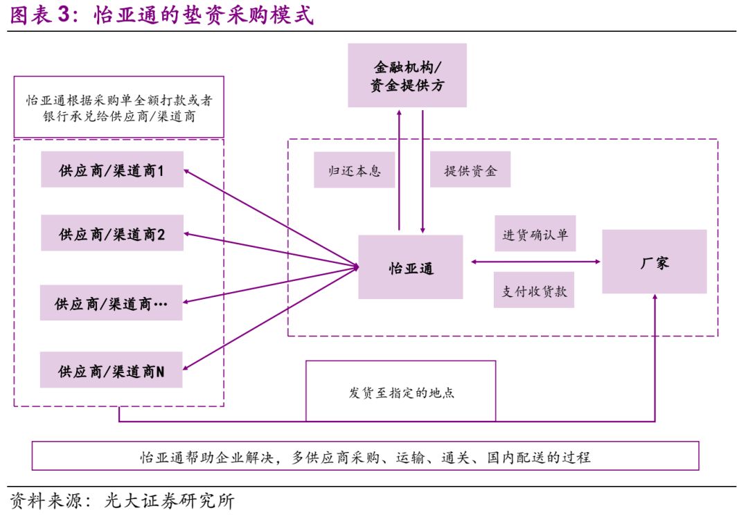 怡亚通是我国第一个以供应链服务为主营业务的上市公司。其中,作为第三方提供垫资采购服务是其重要的业务部分。第三方采购垫资业务兴起的背景是企业将供应链外包,由于产业链分工呈现国际化的布局,因此采购业务也表现为国际化的特点。国际化采购呈现出采购种类众多、货款支付频繁、进口报关手续麻烦的特点,因此,怡亚通在承接外包采购的同时,给企业提供垫资服务,然后再与企业统一结算。金融机构根据怡亚通的采购频率以及采购金额,提供相应的资金支持。