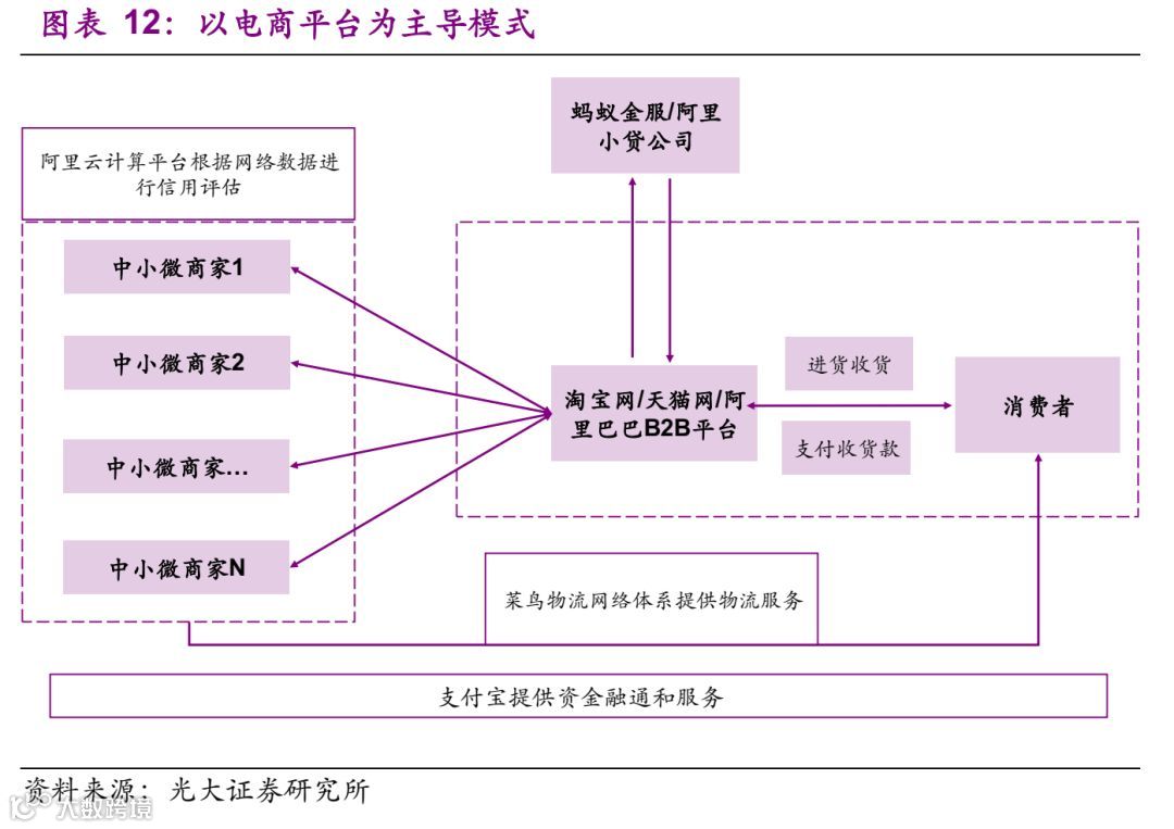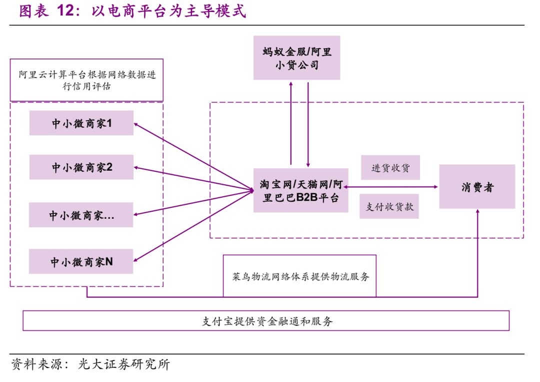 电商平台供应链金融是一个新趋势,例如,蚂蚁金服/支付宝主要是利用阿里生态圈中完善的电商销售、物流服务信息,成为一个现金流闭环的体系。能够实现监督其交易背景的真实性,资金流向的确定性、实现操作的封闭性以及资金的自偿性。这种模式下,没有核心企业,也没有货物的质押过程。资金方依据中小微企业的在阿里网络的采购体系、资金流体系综合分析,提供资金服务,这是一种较为新型的基于供应链体系拓展的金融服务。着重点在于电商平台的采购、运输、销售、资金体系是否具有完整性。