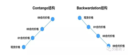 如图所示,商品期货最常见的两种市场结构是Contango和Backwardation,也即正向市场和反向市场。