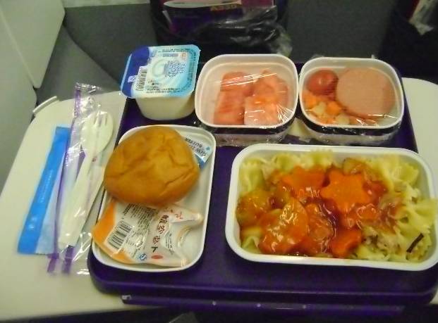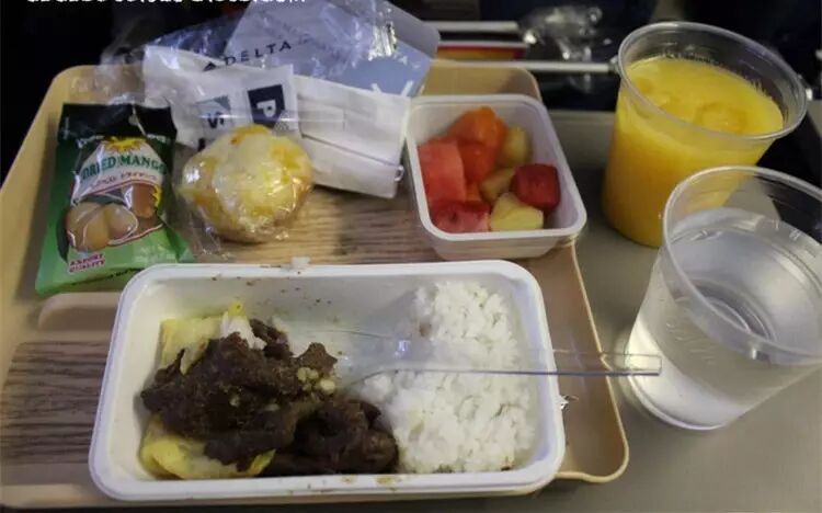以马尼拉到纽约的航班为例,你会吃到这样一些东西。首先从马尼拉起航,吃了一顿午饭,牛肉白饭,水果和菲律宾特产芒果干。(请小伙伴们自动忽略吃了一半的米饭~)▼