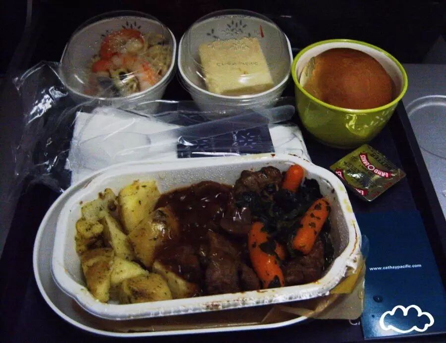 一般的标配是黑胡椒牛肉土豆+Cheesecake+沙拉+小面包(洛杉矶飞香港)▼
