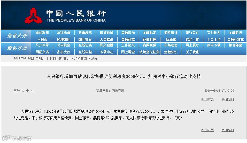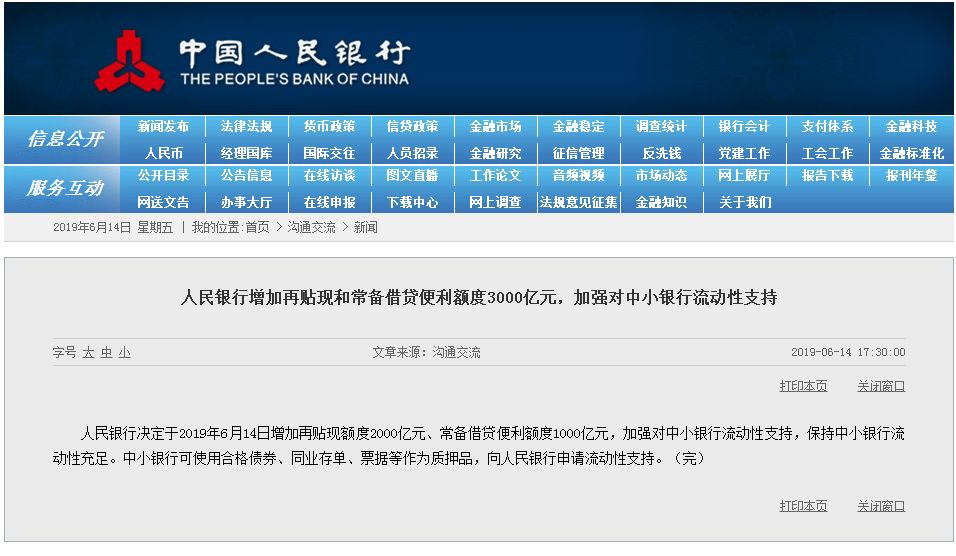 人民银行决定于2019年6月14日增加再贴现额度2000亿元、常备借贷便利额度1000亿元,加强对中小银行流动性支持,保持中小银行流动性充足。中小银行可使用合格债券、同业存单、票据等作为质押品,向人民银行申请流动性支持。