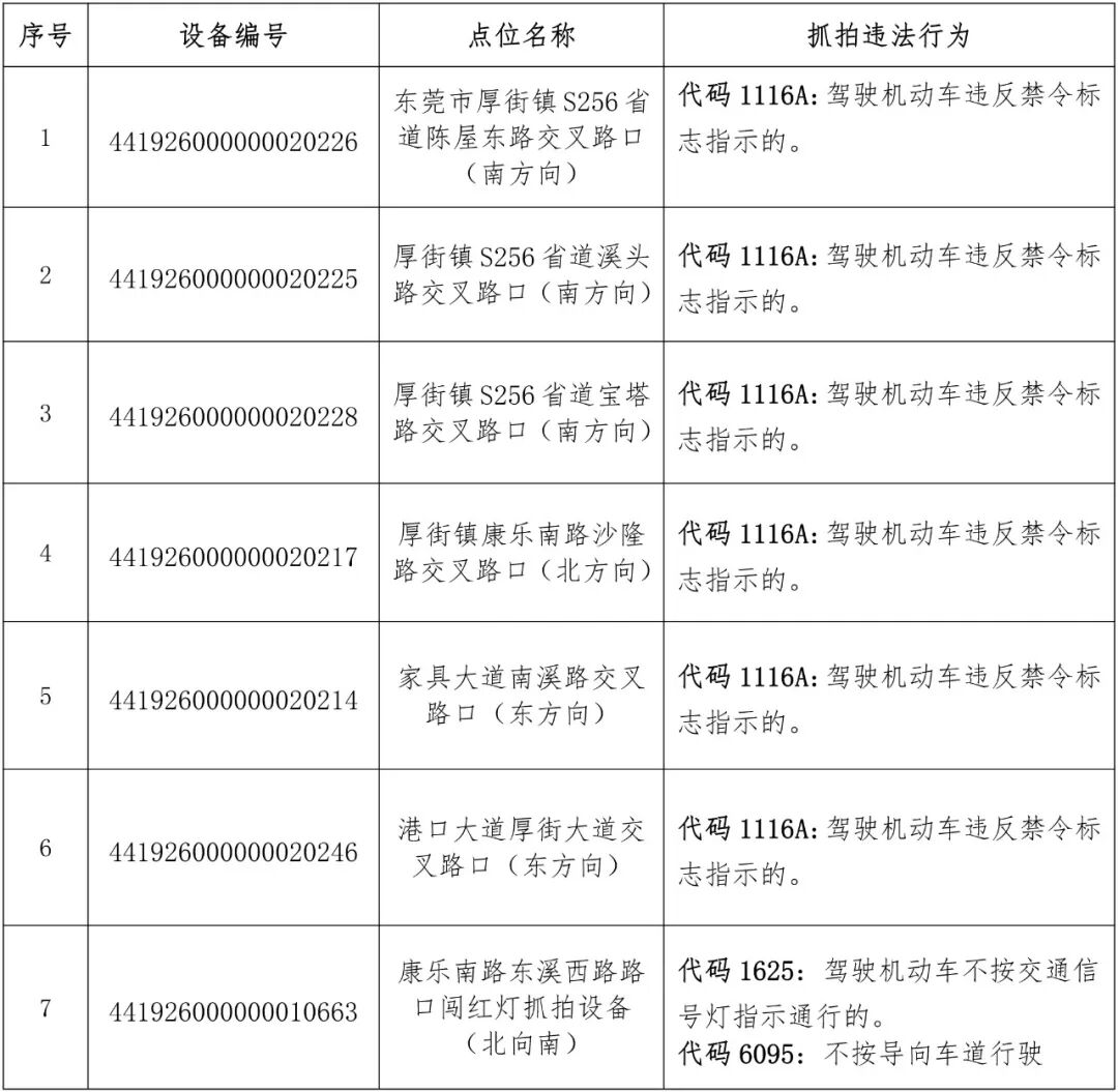 为进一步加强道路交通管理,规范道路交通通行秩序,保障人民群众的生命财产安全,东莞市公安局交通警察支队厚街大队在厚街镇S256省道陈屋东路交叉路口(南方向)、厚街镇S256省道溪头路交叉口(南方向)等路段增设交通技术监控设备。根据《中华人民共和国道路交通安全法》及其配套法规,现将新增交通技术监控设备安装点位予以公示,并于2025年4月25日起正式投入执法。交警部门将依法对有交通违法行为的车辆进行拍摄取证并予以执法,望广大驾驶人守法出行、安全驾驶。