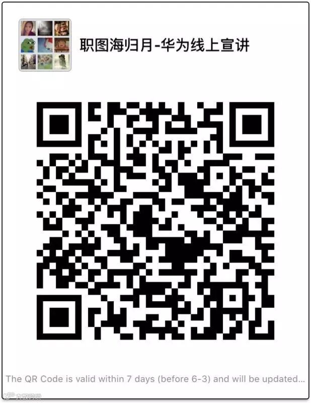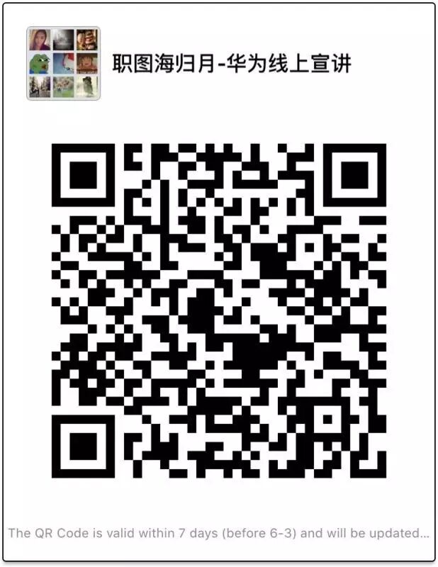 扫下方二维码,加入华为宣讲info群,有任何问题可以随时提问,还会邀请华为recruiter入群和大家交流!