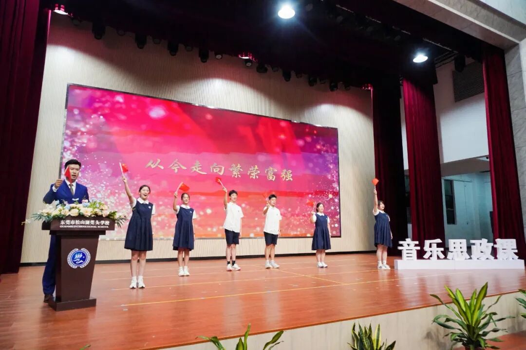 东莞市松山湖莞美学校初中部教学主任王巍、初中部教学处副主任何海洋、初中部德行处主任陈冬梅、小学部德行处主任周艳蓉与学校师生代表齐聚一堂,在音乐思政课的沉浸式艺术演绎中重温百年党史,感悟时代精神。