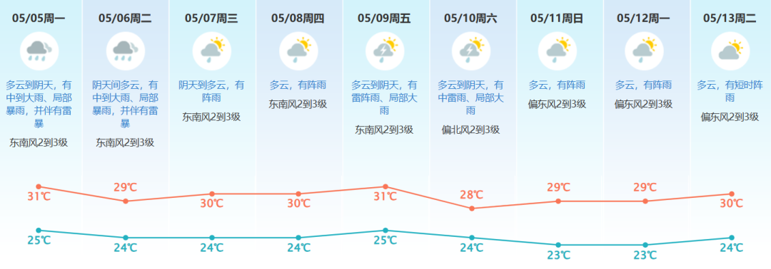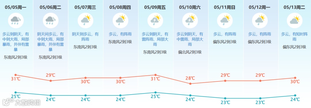 预计东莞五一假期末期雷雨稍明显,其中:5-6日有中到大雨、局部暴雨,并伴有雷暴,强降水时段在5日下午到夜间、6日傍晚到夜间;7-8日有阵雨;9-10日天气不稳定,有雷阵雨、局部大雨;展望11-13日多云,有阵雨。
