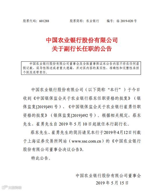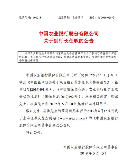 5月15日农业银行公告称,银行于今日收到《中国银保监会关于农业银行蔡东任职资格的批复》(银保监复[2019]491号)、《中国银保监会关于农业银行崔勇任职资格的批复》(银保监复[2019]492号)。根据相关规定,蔡东、崔勇自2019年5月10日起就任农业银行副行长。