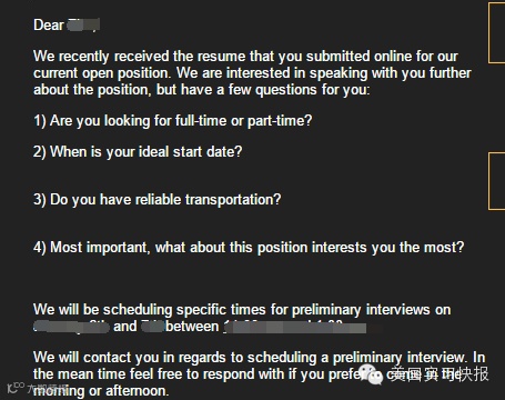 这是邮件里截图,申请的时候那上面写的很清楚是Full-Time, 却在邮件里问要全职还是兼职。而且还会问有没有Reliable Transportation。这份工作其实找的是Sales。希望大家在看到这样的邮件,或者收到一些公司的电话,问类似的问题,他们找的是sales person。就不要去傻傻的浪费时间去面试了。
