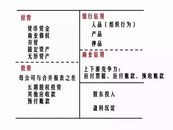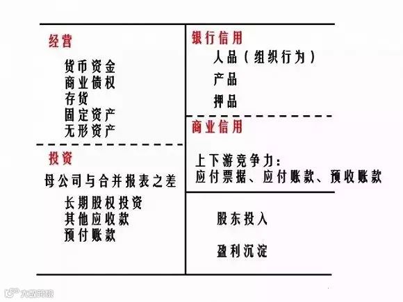 2、再看负债方面,其实所谓的负债就是一种信用,信用分为两种,一种是银行信用,一种是商业信用。银行信用主要是银行的短期借款和银行的长期借款。