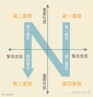 第一象限: 重要又紧急的事情。可能包括限期完成的工作或者会议,作业临近的deadline。