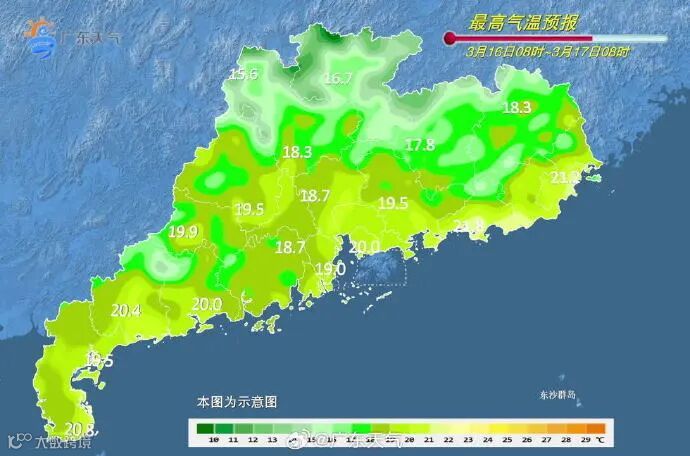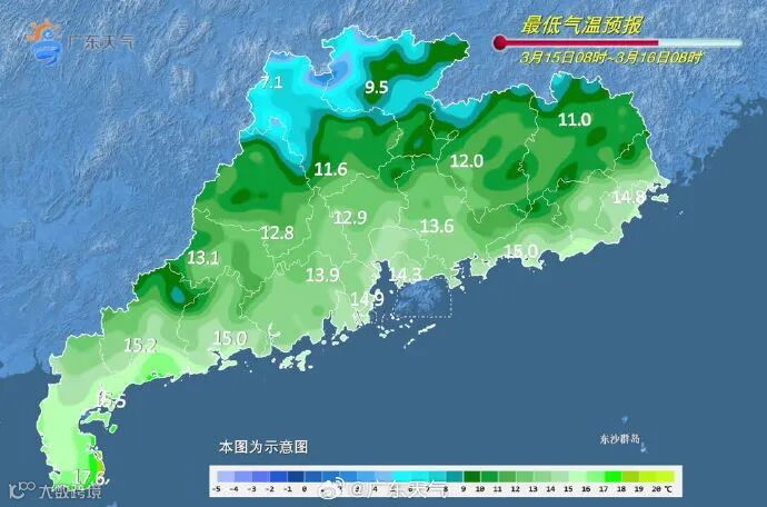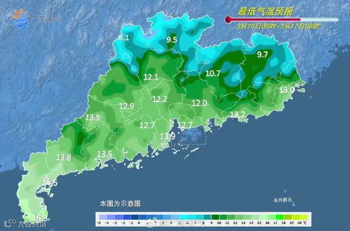 3月15日至16日,受较强冷空气影响,广东省日平均气温自北向南下降6~9℃。