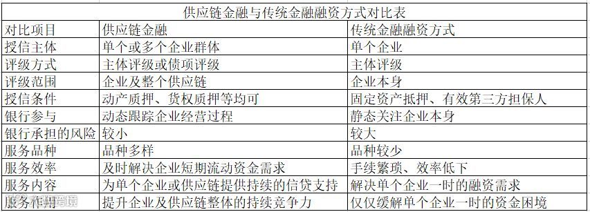 供应链金融也区别于传统的固定资产抵押贷款,它充分利用供应链生产过程中产生的动产或权利作为担保,即主要是基于商品交易中的存货、预付款、应收账款等资产的融资,并将核心企业的良好信用能力延伸到供应链上下游中小企业;此外其还强调授信还款来源的自偿性,即把销售收入直接用于偿还授信;供应链金融融资模式不仅引入了核心企业的信用,进行信用捆绑,而且也引入了物流企业的合作,承担监管货物的责任。其具体与传统融资方式的区别见下表所示。