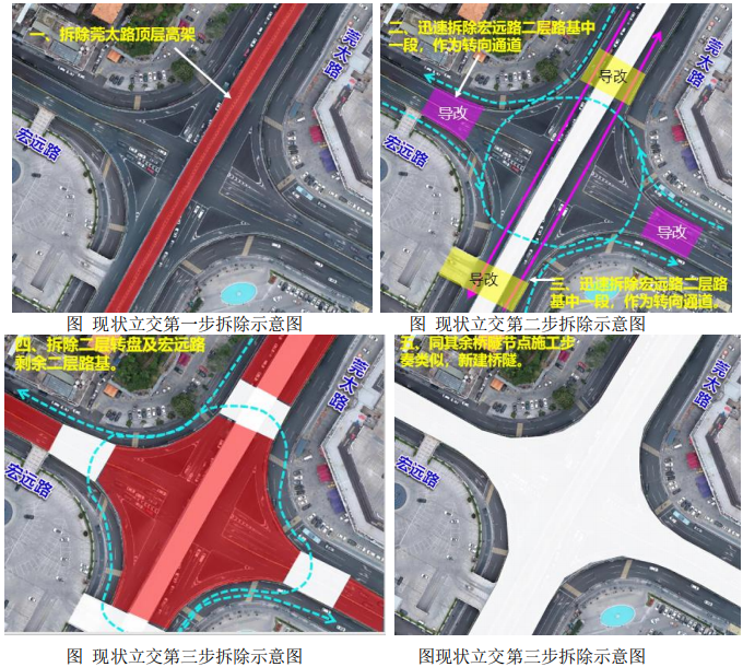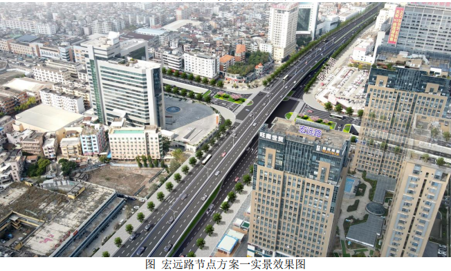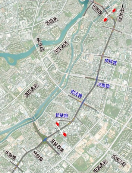 ▶宏远路节点最为复杂,莞太路主线双向四车道桥梁上跨宏远路,宏远路则设置双向四车道隧道下穿莞太路,形成三层菱形立交,宏远酒店旁旧桥拆除后将新建长约315米的高架桥;
